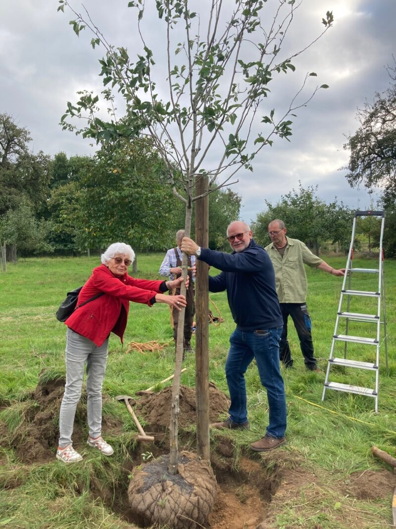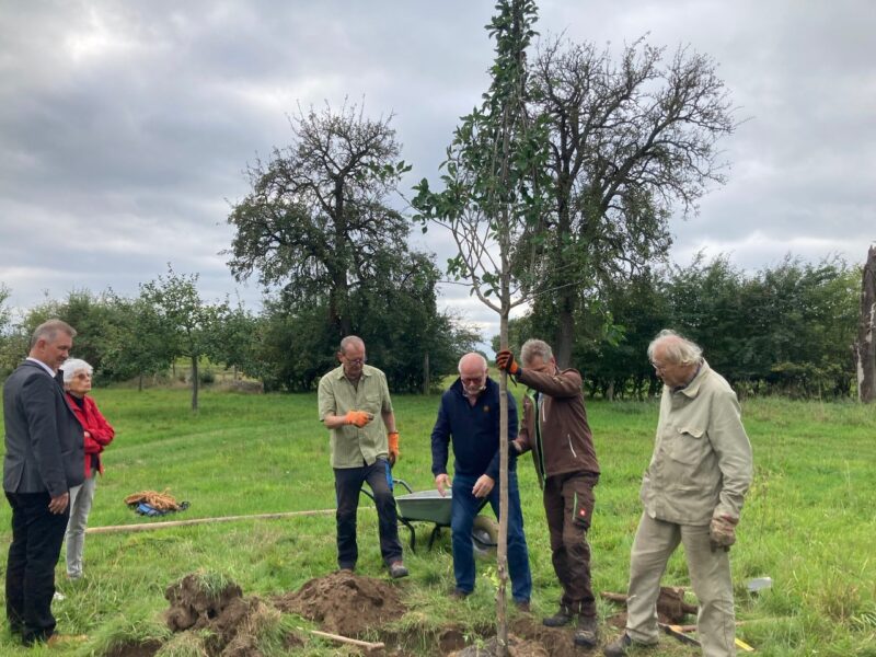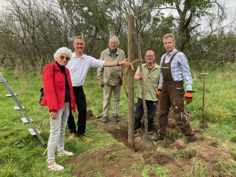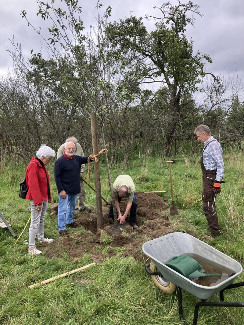 Mit Spaß und Freude haben Doris, Jürgen, Horst, Paul-Georg und Karlheinz unter fachmännicher Begleitung von Peter und Gregor Alms (NABU) den Baum gepflanzt.